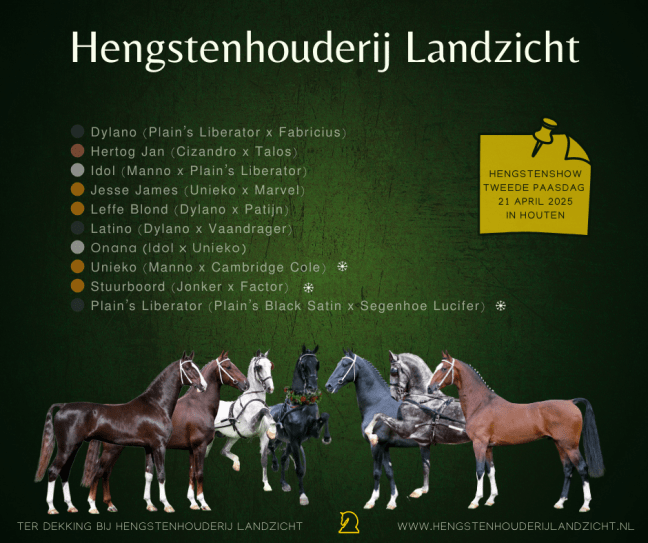 De eerste veulens zijn alweer geboren, en de hengstenkeuzes voor dit seizoen worden volop gemaakt. Ook bij ons zijn de voorbereidingen in volle gang! Dit jaar bieden we weer een sterk en gevarieerd aanbod aan tuigpaardhengsten. Beschikbare hengsten 2025Dylano (π˜—π˜­π˜’π˜ͺπ˜―β€™π˜΄ π˜“π˜ͺ𝘣𝘦𝘳𝘒𝘡𝘰𝘳 𝘹 𝘍𝘒𝘣𝘳π˜ͺ𝘀π˜ͺ𝘢𝘴) Hertog Jan (𝘊π˜ͺ𝘻𝘒𝘯π˜₯𝘳𝘰 𝘹 π˜›π˜’π˜­π˜°π˜΄) Idol (π˜”π˜’π˜―π˜―π˜° 𝘹 π˜—π˜­π˜’π˜ͺπ˜―β€™π˜΄ π˜“π˜ͺ𝘣𝘦𝘳𝘒𝘡𝘰𝘳) Jesse James … Lees verder Het dekseizoen komt eraan!